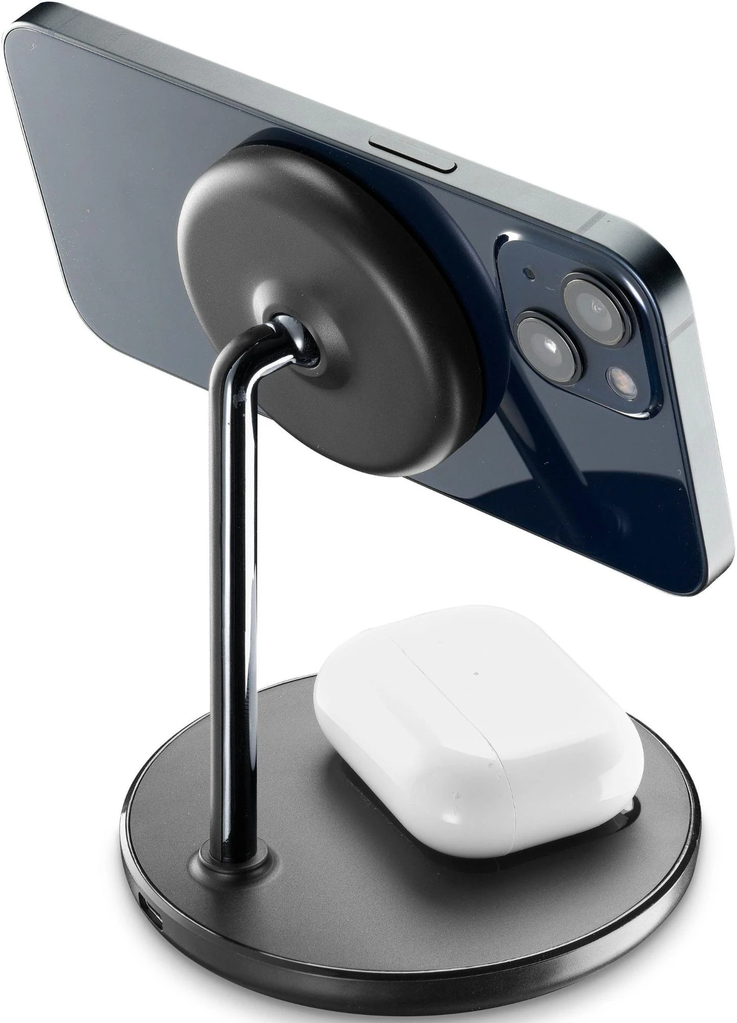 MAG DUO WIRELESS CHARGER ist die Tischhalterung mit magnetischem, kabellosem Ladegerät speziell für iPhone-Modelle, die mit der MagSafe-Technologie kompatibel sind.An der Unterseite der Halterung befindet sich ein Pad zum kabellosen Aufladen von Airpods und anderen mit dieser Technologie kompatiblen Kopfhörern.Für die Schnellaufladung mit einer Ladeleistung von 7,5 W wird ein adaptives USB-C-Netzteil mit mindestens 20W benötigt, das nicht im Lieferumfang enthalten ist.