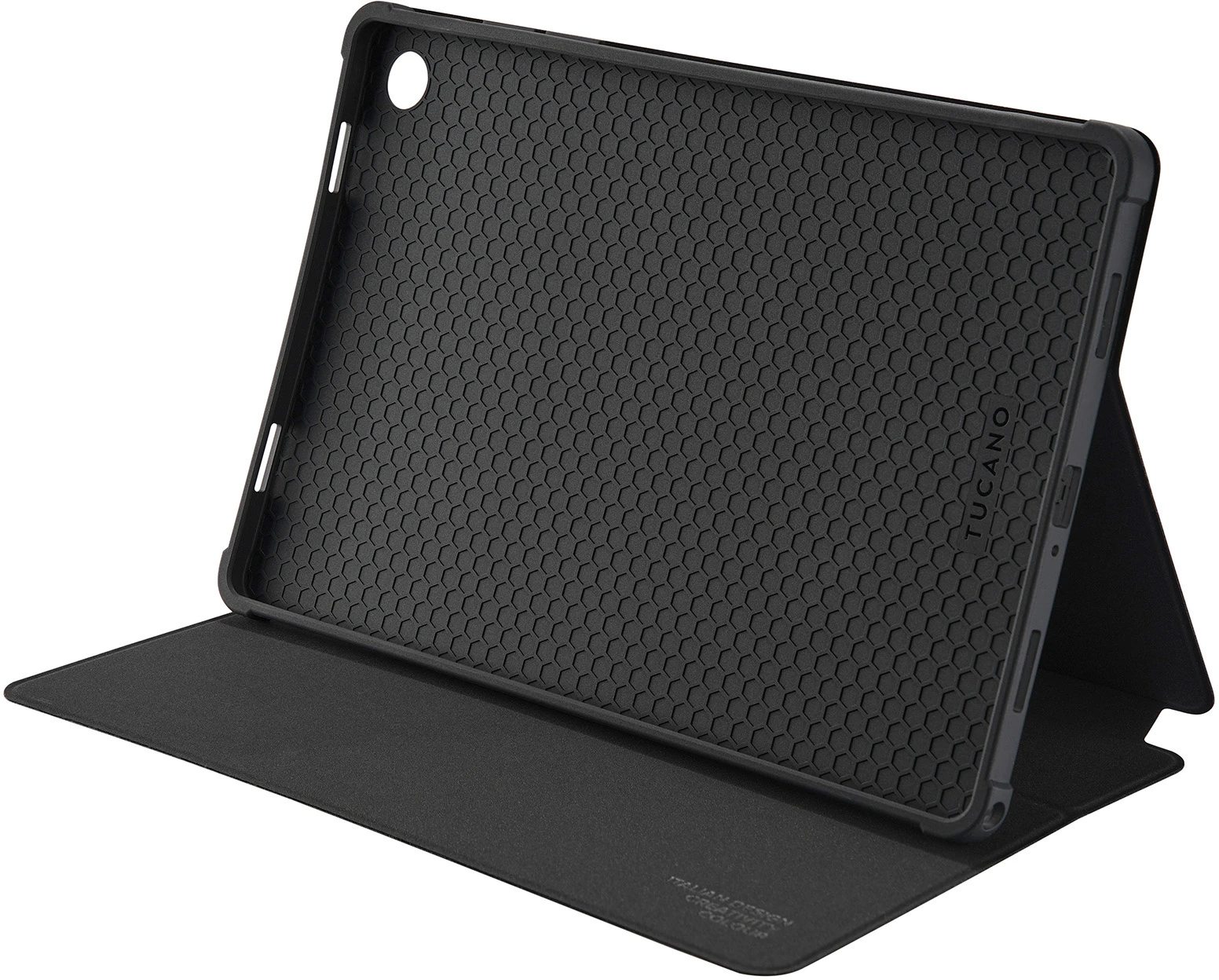 Samsung Galaxy Tab Hülle aus PU in Nylonoptik, hergestellt aus recyceltem Kunststoff. Die Innenseite besteht aus weichem, kratzfestem Material, und die Rückseite mit Kameraausschnitt ist aus weichem, schützendem TPU gefertigt. Die Vorderseite lässt sich in einen praktischen Ständer zum Schreiben und Lesen verwandeln. An der Außenseite befindet sich ein integrierter Ladeschlitz für den S Pen. Diese Hülle wurde aus drei 500-ml-Plastikflaschen hergestellt.